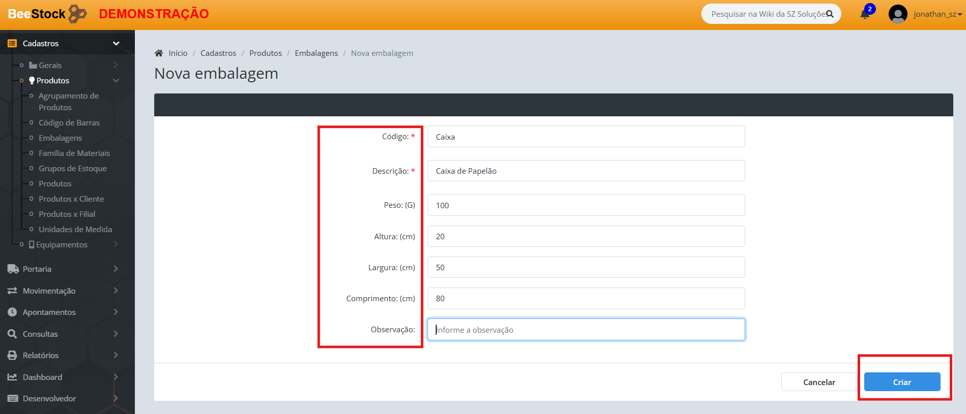 Ao incluir uma nova embalagem, o usuário deverá preencher os seguintes campos, conforme imagem e descrição abaixo: