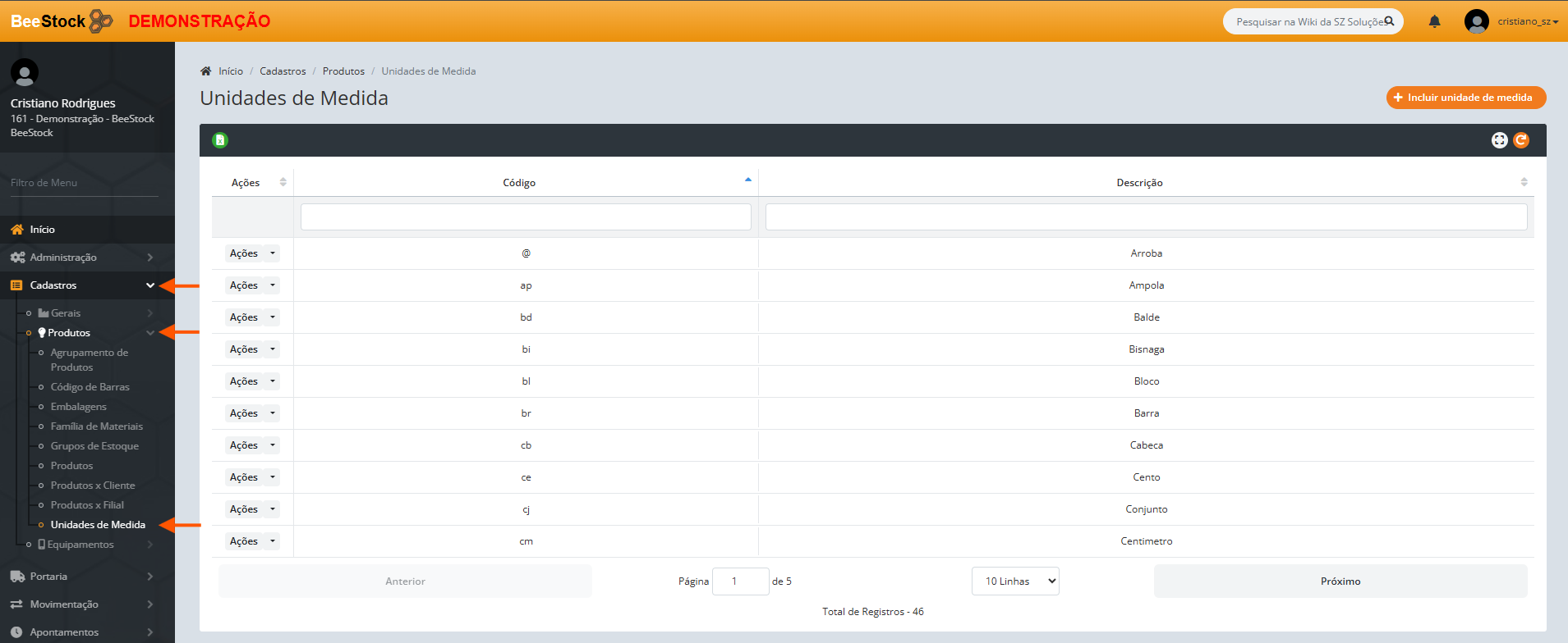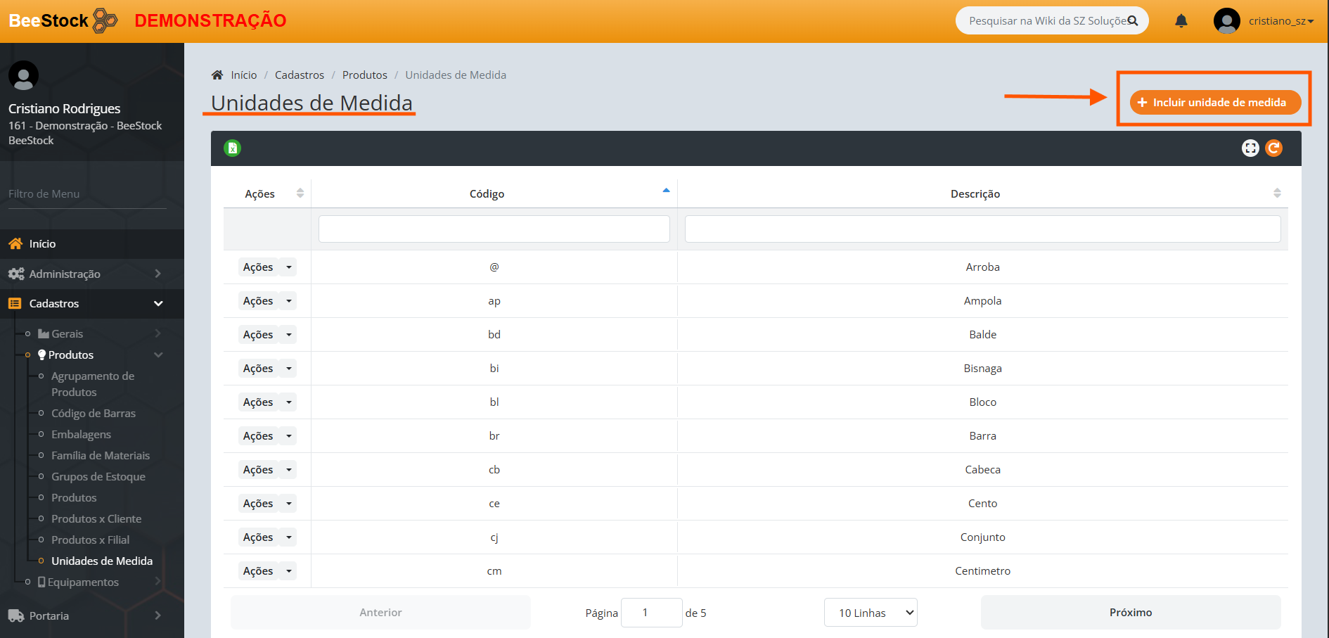 1. Clique no botão laranja + Incluir unidade de medida.
