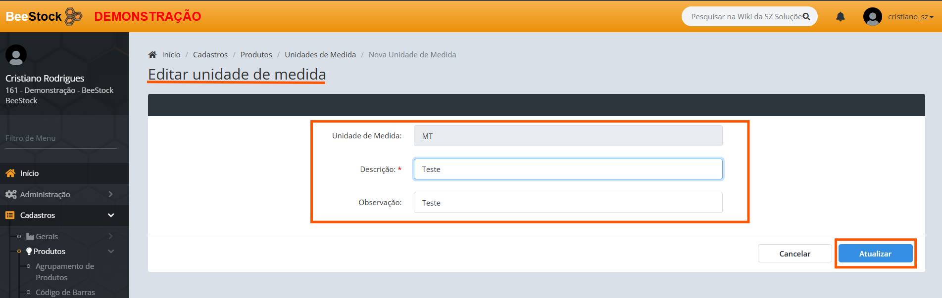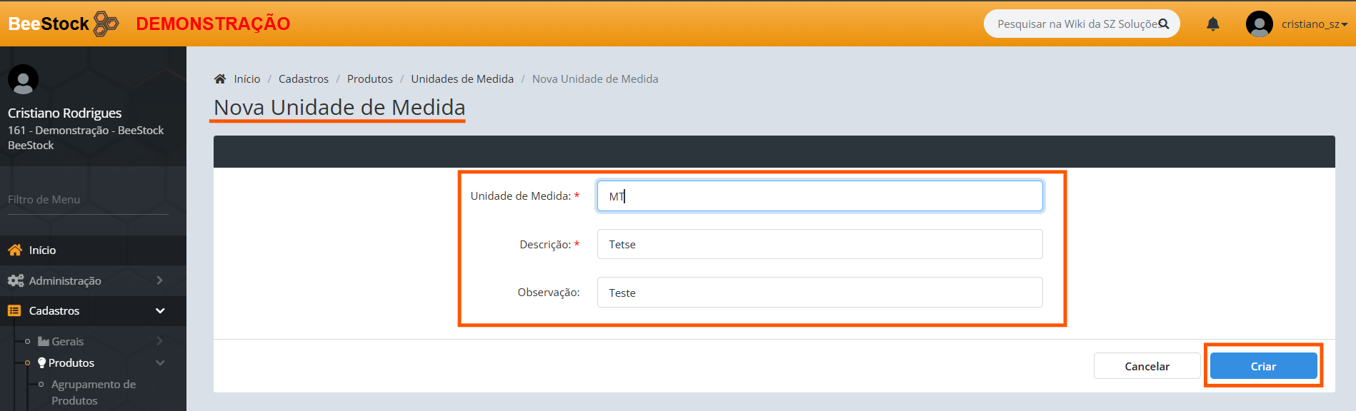 2. Na tela Nova Unidade de Medida, Preencha as informações e após clique em Criar :