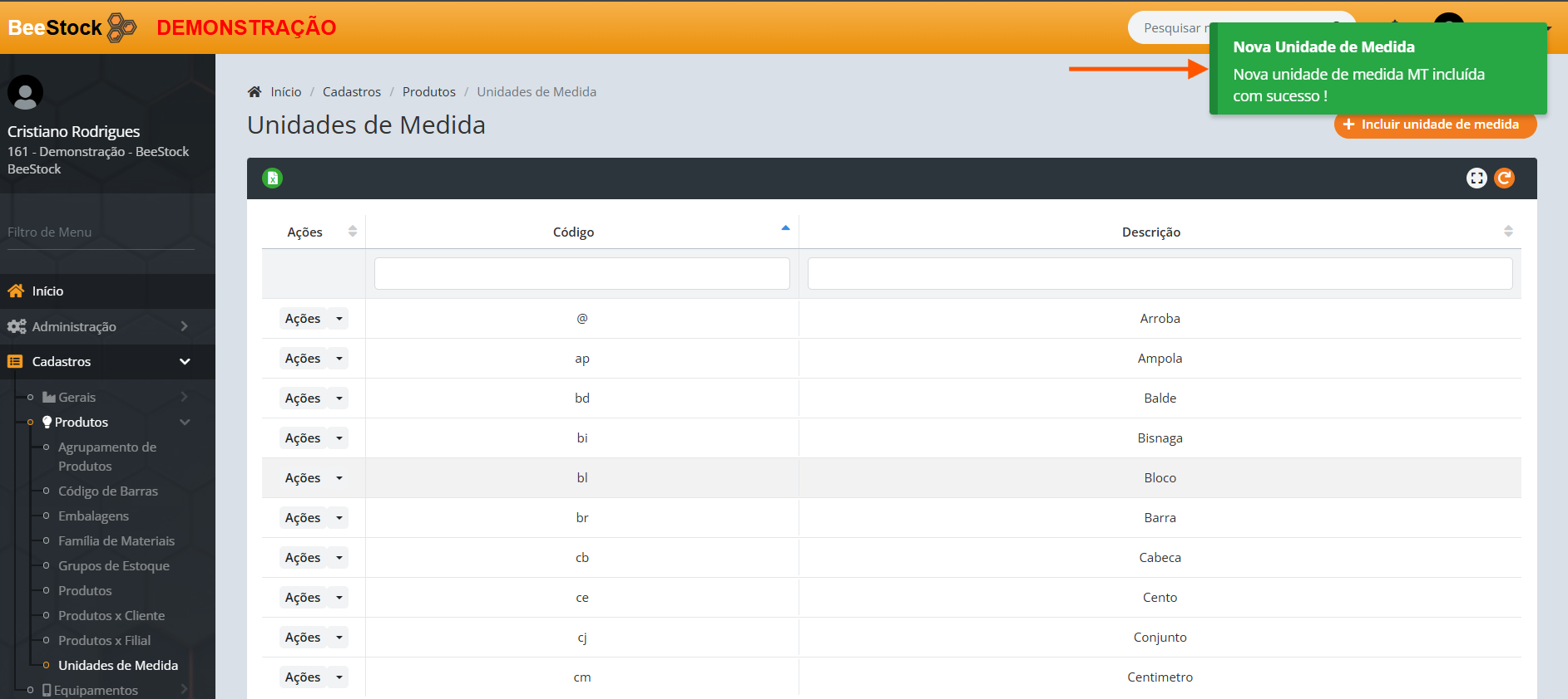 3. Ao clicar em Criar, a nova Unidade de Medida será criada: