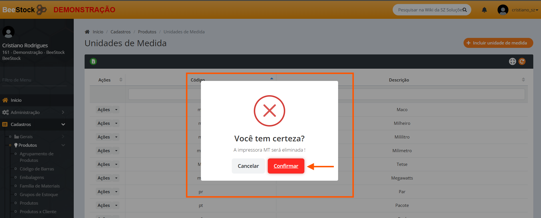 4. No botão Ações > Eliminar poderá excluir a Unidade de Medida se não estiver vinculada a outros registros do sistema.