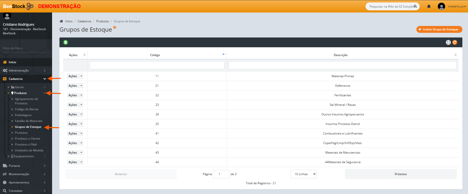 1. Clique no botão laranja + Incluir Grupo de Estoque.