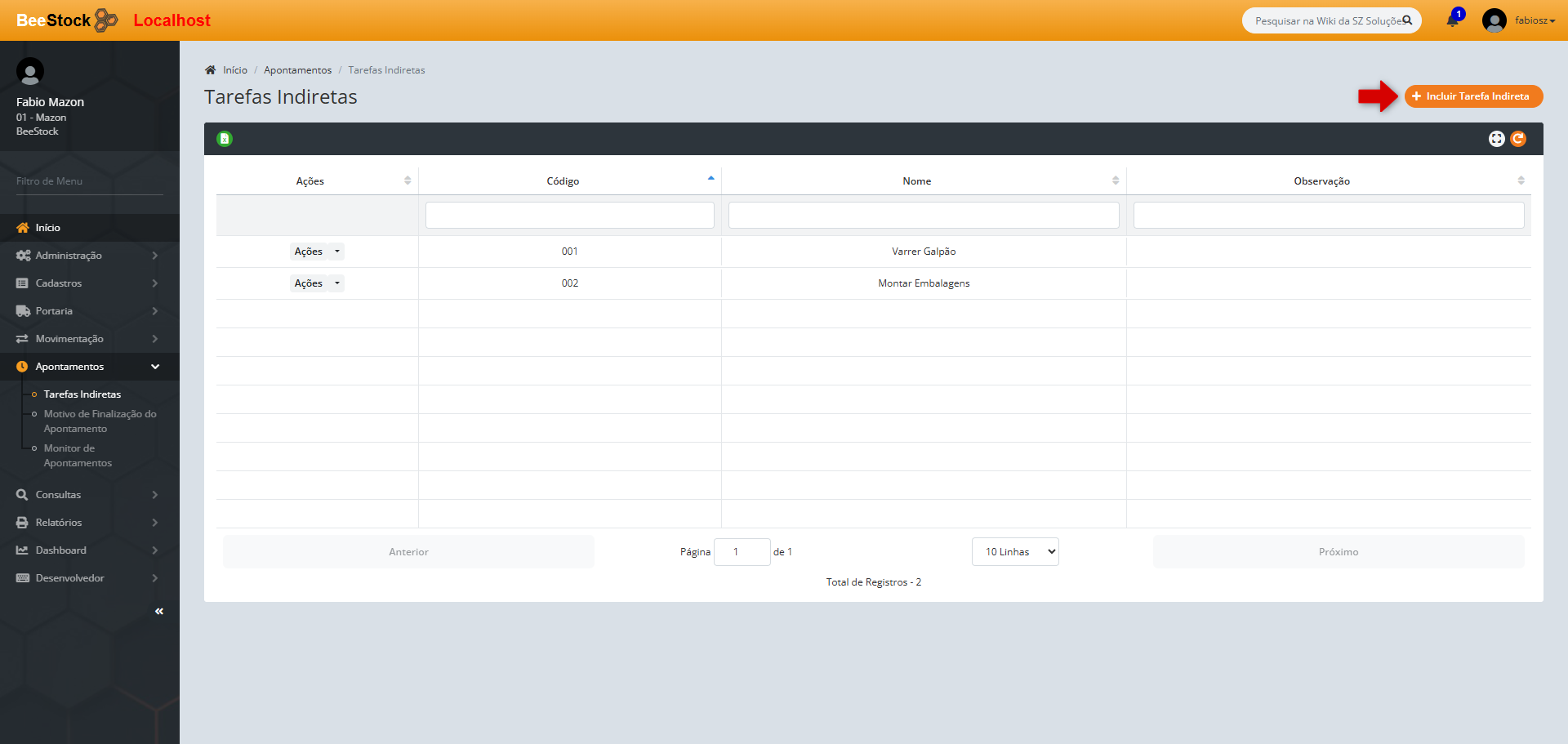 1. Acesse o menu Apontamentos > Tarefas Indiretas.