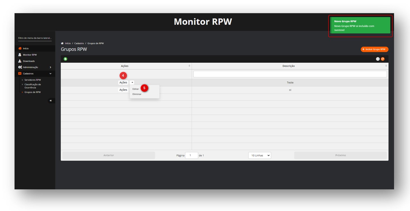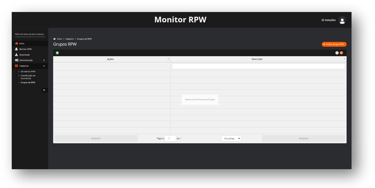 Localizada em Início > Cadastro > Grupos de RPW nesta tela é possível criar grupos de RPW que serão apresentados no Monitor RPW, listados como filtros.