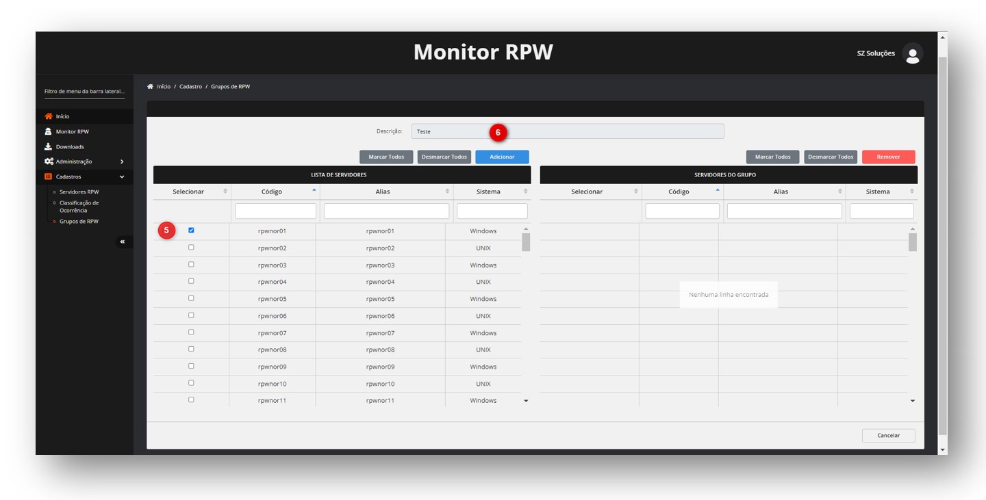 4. Para poder colocar os RPWs desejados dentro do grupo, precisamos ir na coluna selecionar e habilitar o flag do RPW. Após habilitar o flag, ir no campo adicionar e cancelar da página.