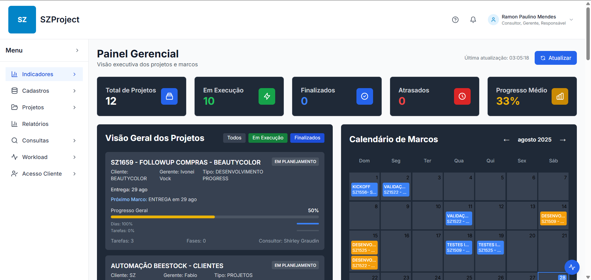 Esta tela centraliza as informações mais importantes de todos os projetos cadastrados. É o seu ponto de partida para entender o que está acontecendo na empresa.